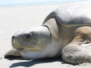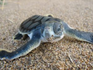 Flatback turtles are quite distinct looking. Adults have an olive grey carapace (shell), which is flat compared to other marine turtle species and curls up on the outer edges. Their carapace grows to about 90 cm in length. Flatback hatchlings are quite distinct looking as they are pale grey in colour with dark edges around the edges of the scutes (scales) on their carapaces.